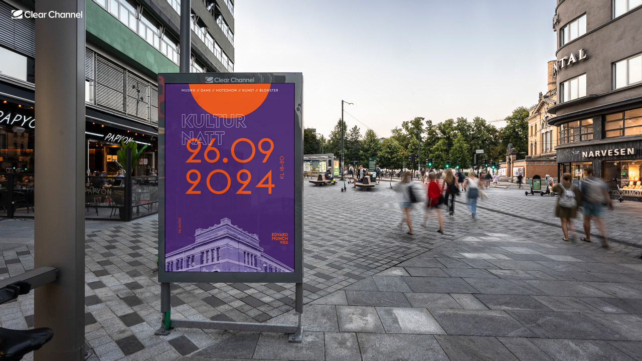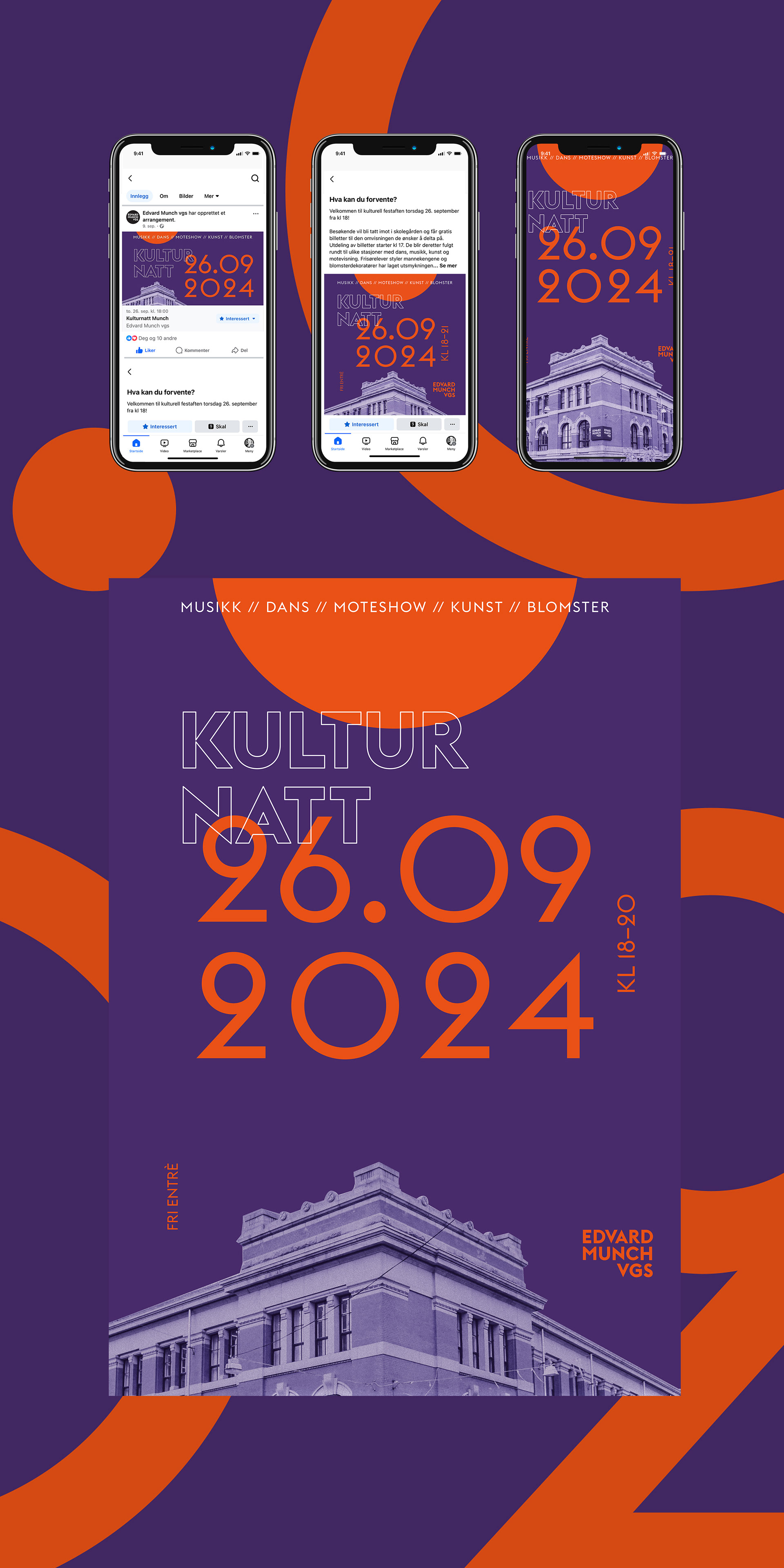 Kampanje med plakater og SoMe-materiell for årets Kulturnatt på Edvard Munch videregående skole. Møt opp i