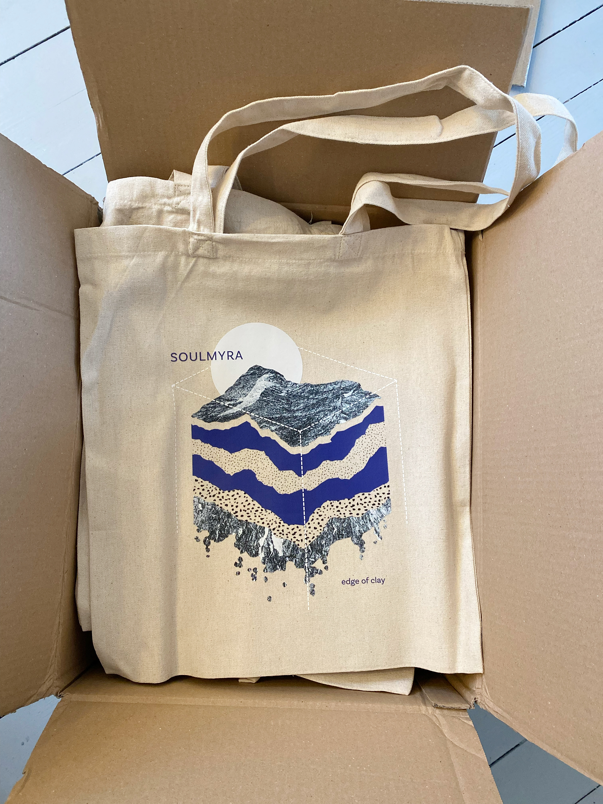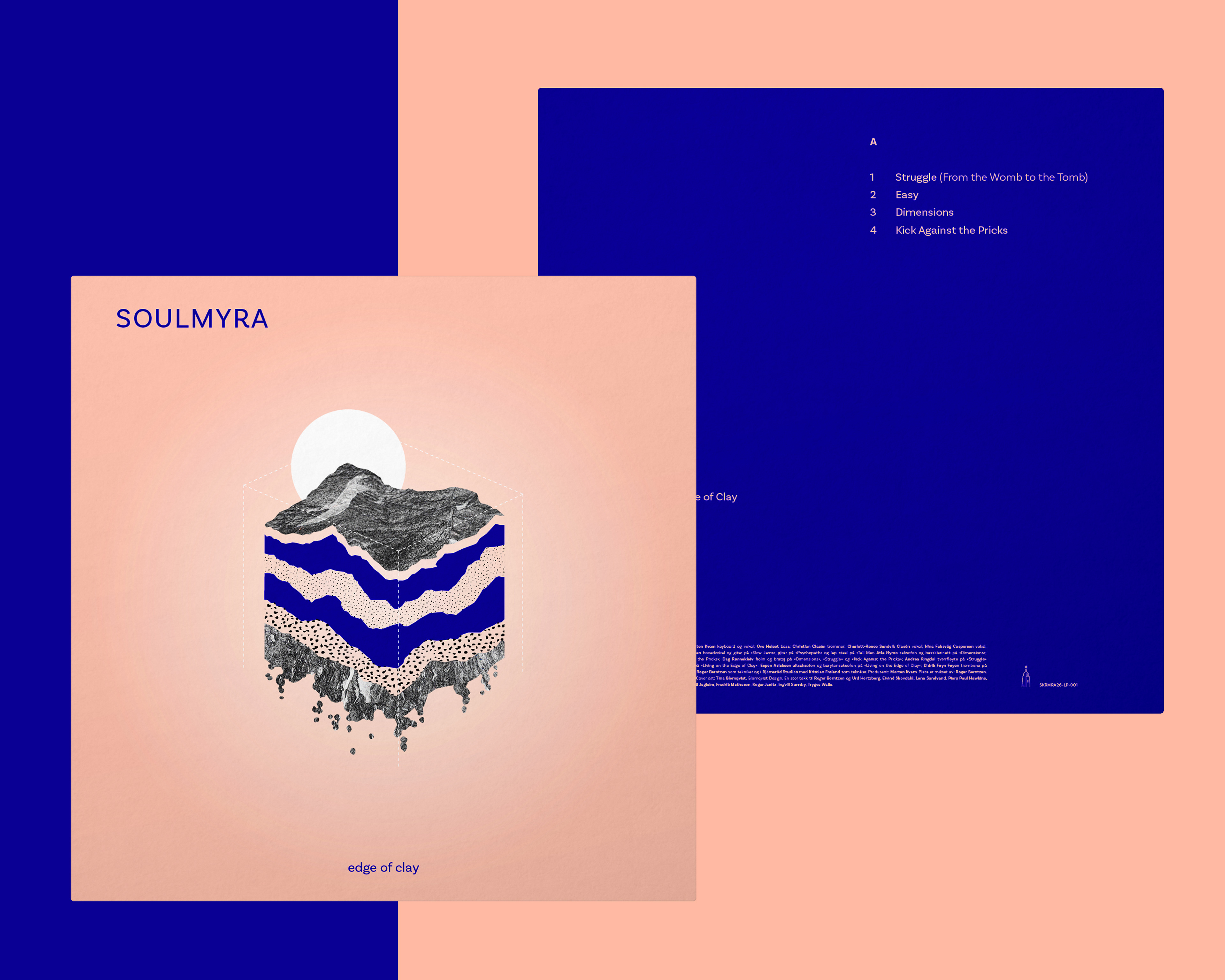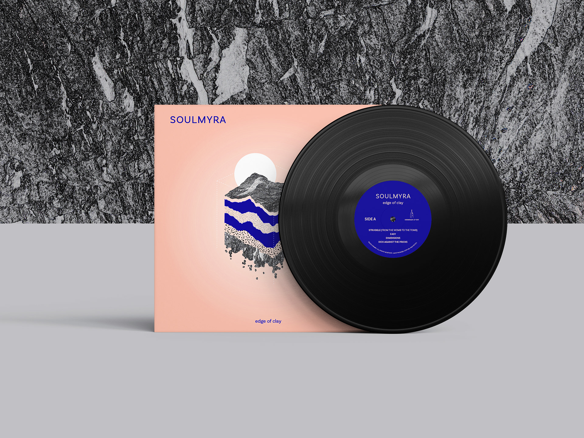 LP-cover og merch for Soulmyra «edge of clay». Platetittelen viser til det omdiskuterte kvikkleireområdet i Moss, derav idéen med tverrsnitt av jordlag som grafisk form. Coveret er trykket med Pantonefarger som skaper ektra kontrast og glans. Vinyl er trykket av Discrepublic, handlenett av Konsis. Design og foto: Blomqvist Design